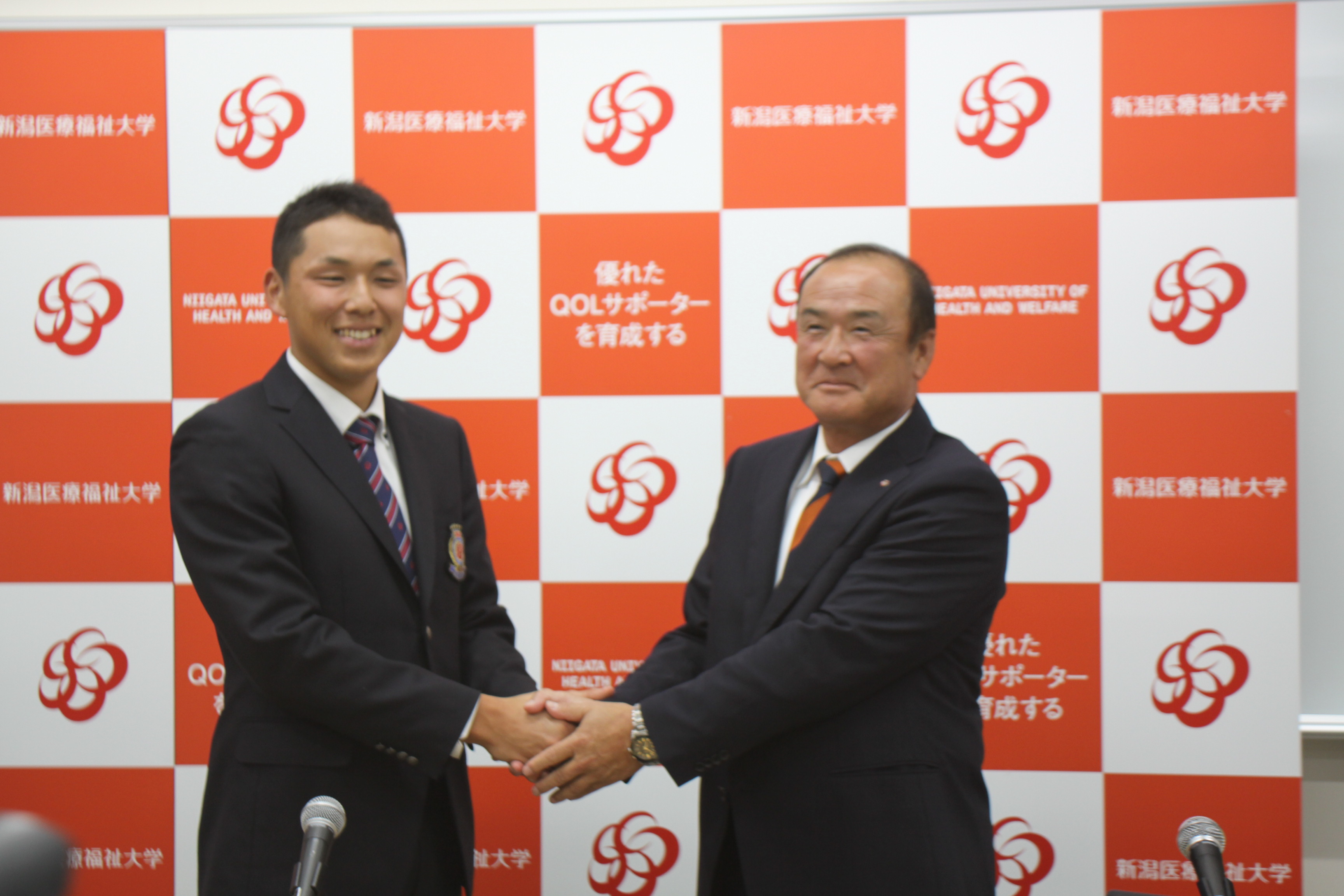 本日開催された2016年プロ野球ドラフト会議にて、本学硬式野球部の笠原祥太郎選手(健康スポーツ学科4年・新津高校出身)が中日ドラゴンズより4位で指名されましたのでご報告いたします。笠原選手のプロ入りは、新潟県内の大学から初となる快挙です。