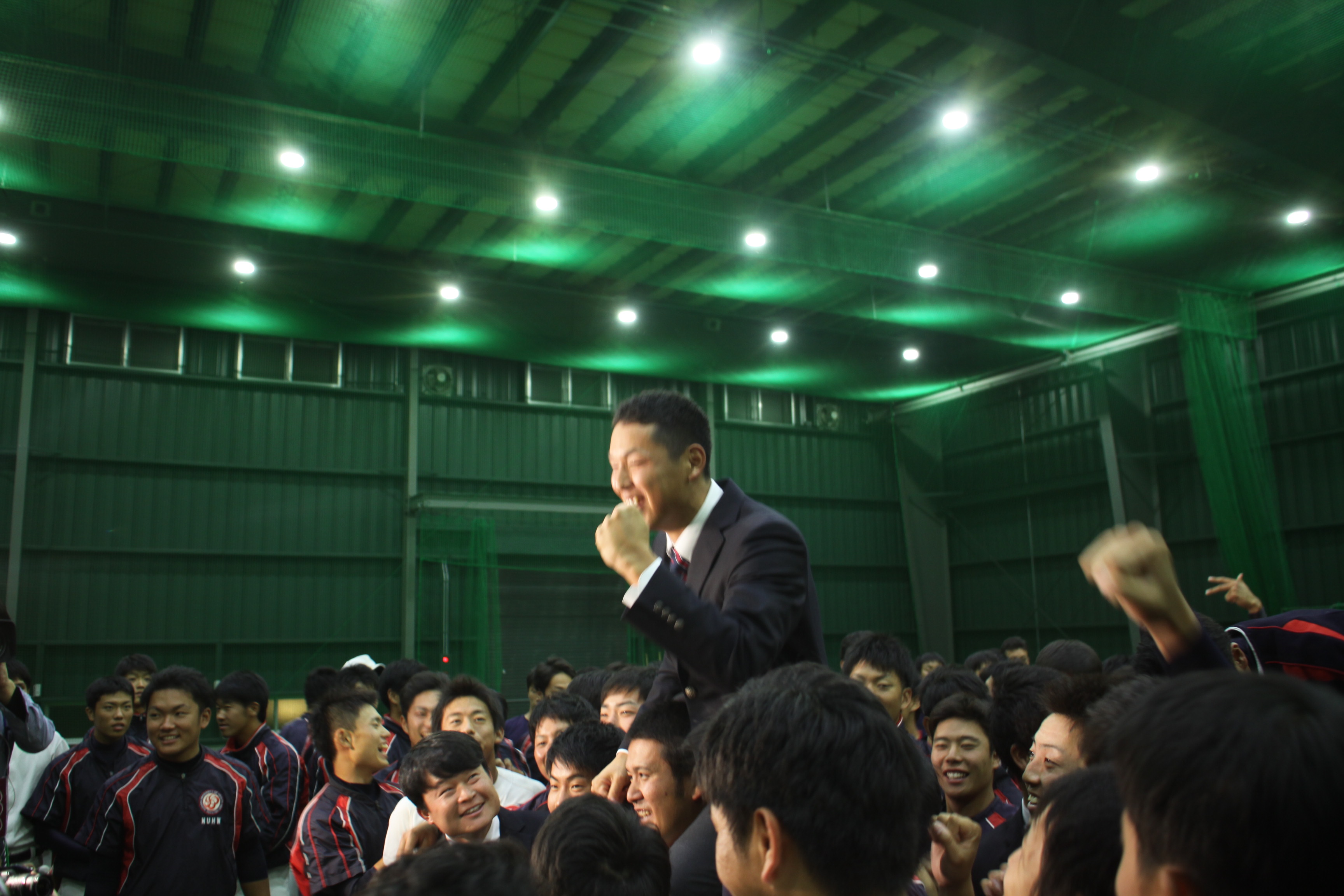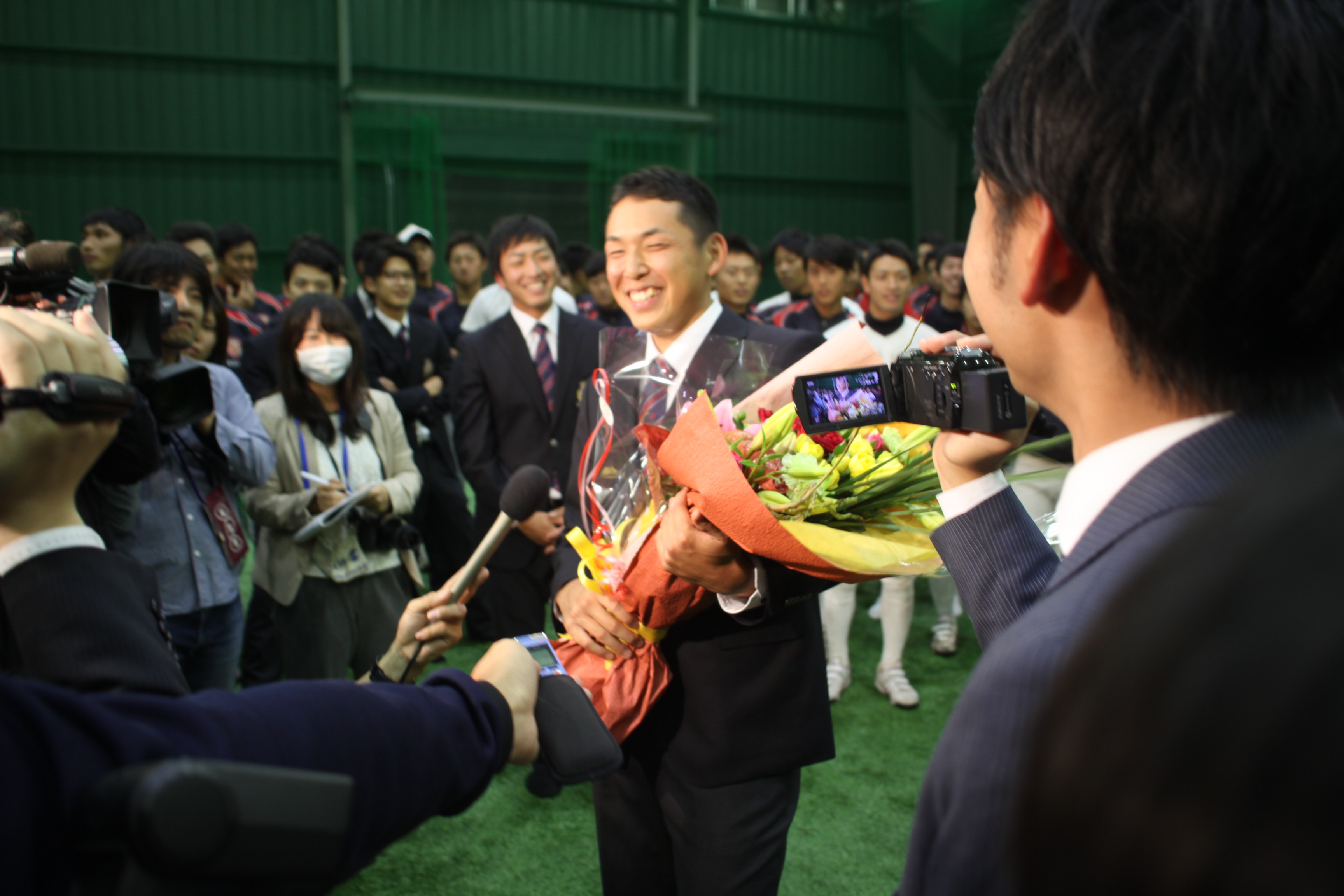 指名を受けた後、すぐに記者会見が行われ、笠原選手は指名された喜びや中日ドラゴンズ入団に向けての意気込みを述べていました。その後、部員たちにより笠原選手の胴上げが行われ、佐藤和也監督や部員たちと喜びをわかち合っていました。