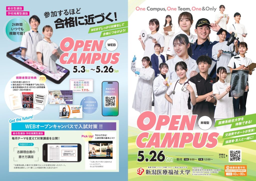 5月26日(日)に開催する来場型オープンキャンパスと、5月3日(金)~26日(日)に行うWEBオープンキャンパスのご案内です。