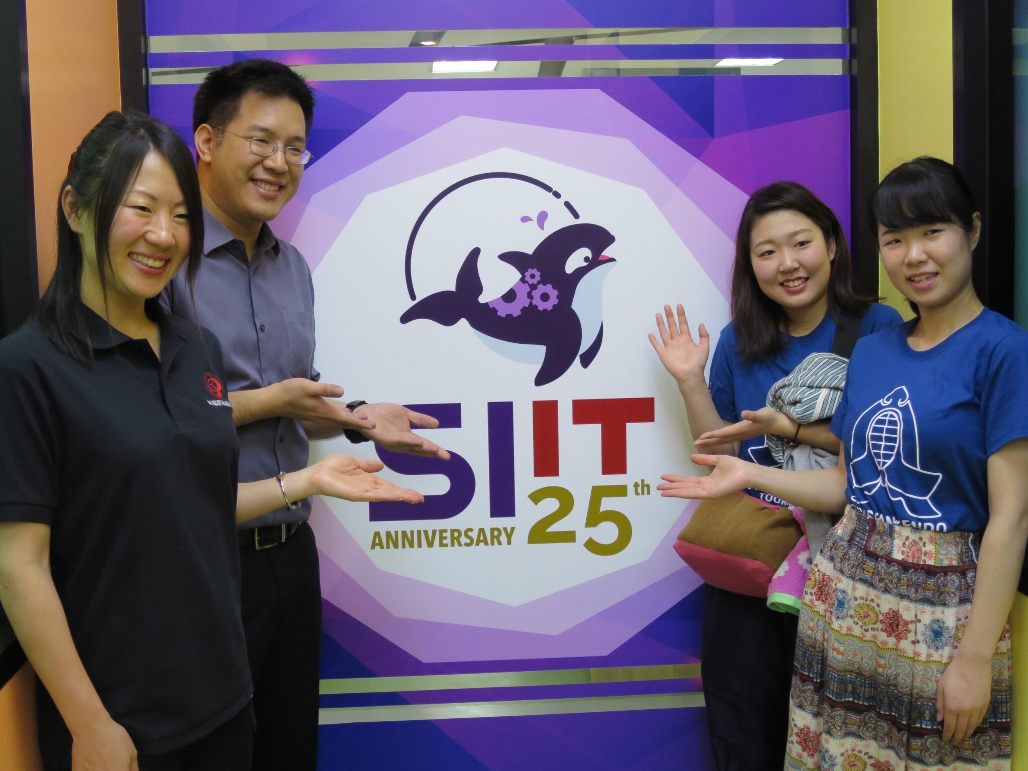 ・タマサート大学SIIT学部の看板前、ご案内してくださった先生と。