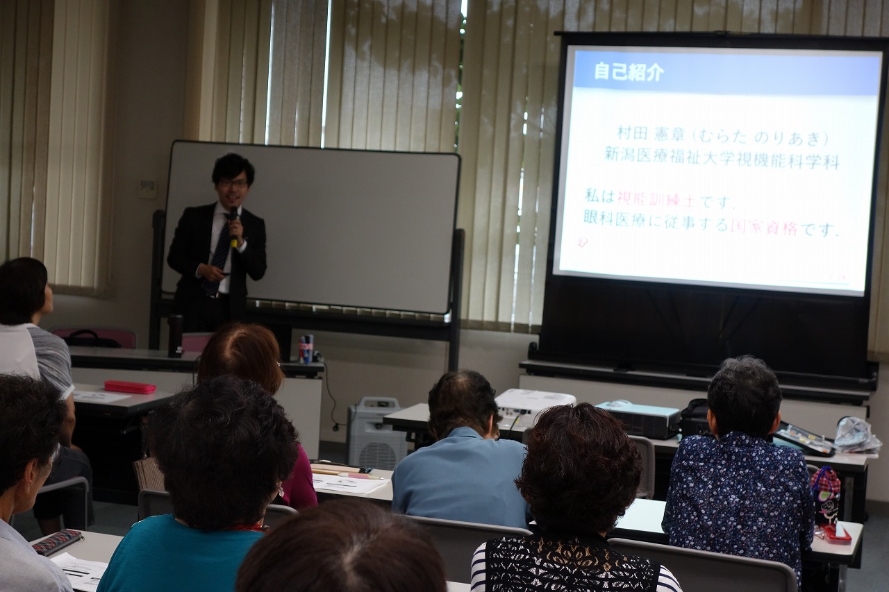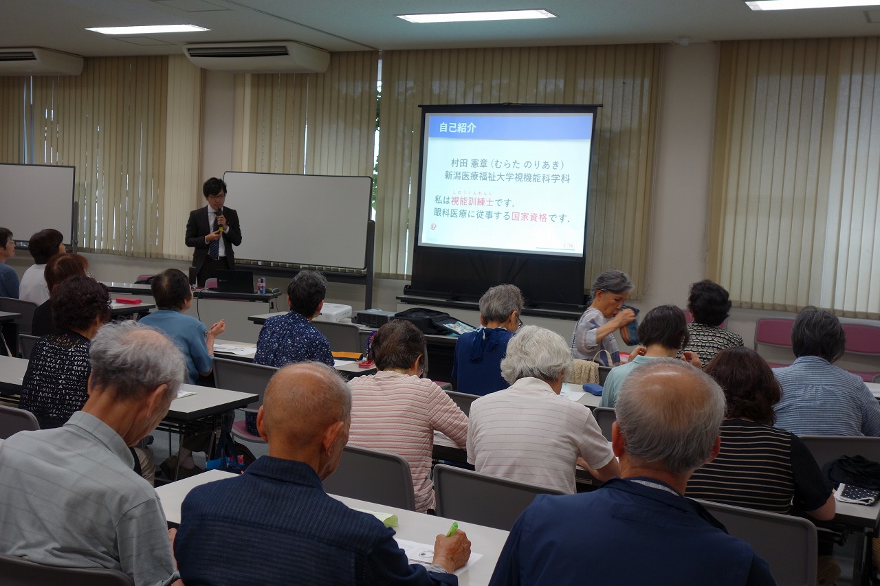 とよさか中高年教養大学は北区民の方を対象に毎月13科目が開講されており、本学はこのうち「健康長寿学」を担当しています。6月29日(木)に今年度3回目の「健康長寿学」が葛塚コミュニティーセンターにて開講され、50人の方が参加されました。講師は視機能科学科の村田憲章先生が務められ、「ご存知ですか?近眼や老眼、メガネの秘密!」視覚機能に関する幅広いお話をいただきました。