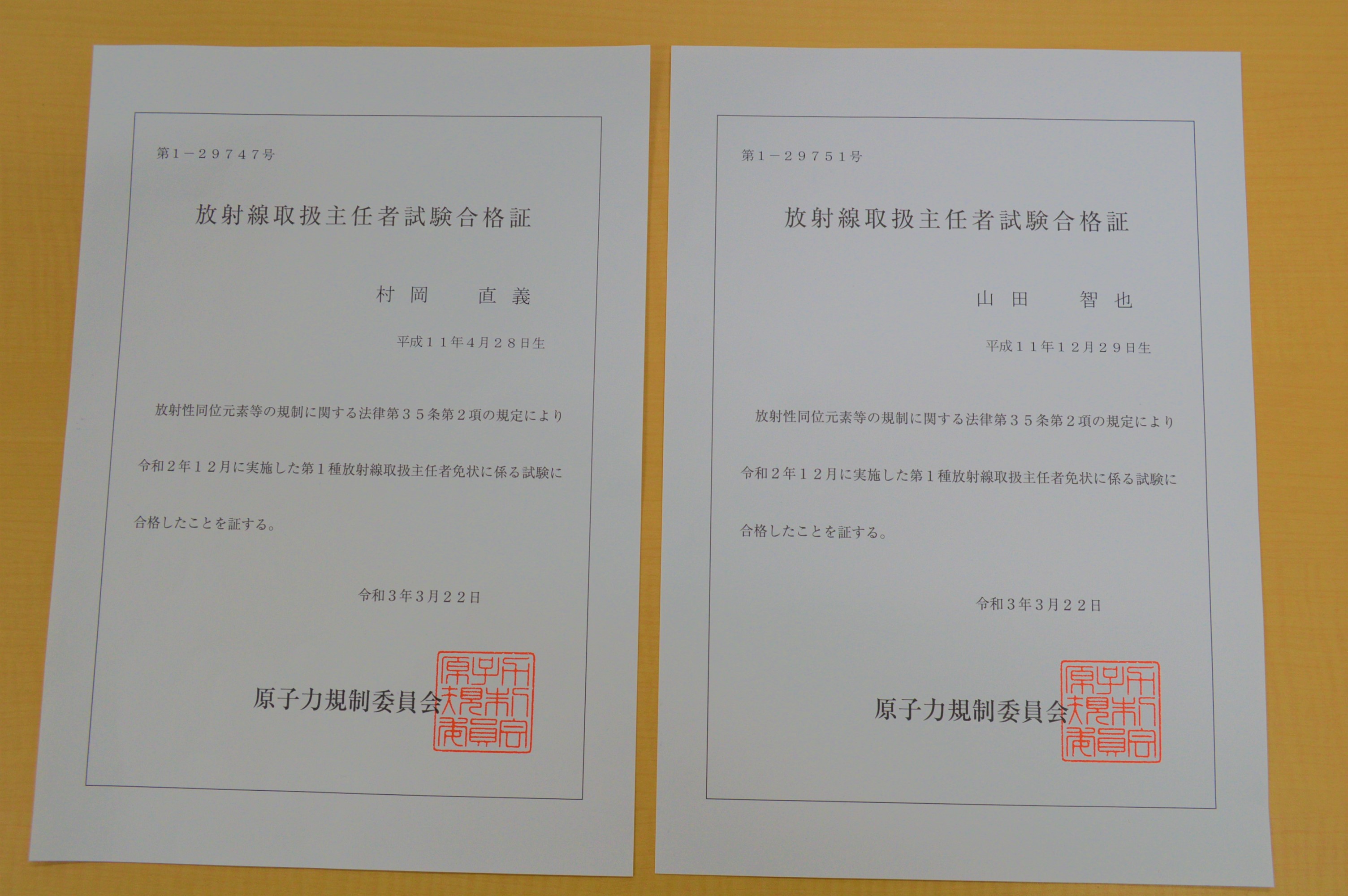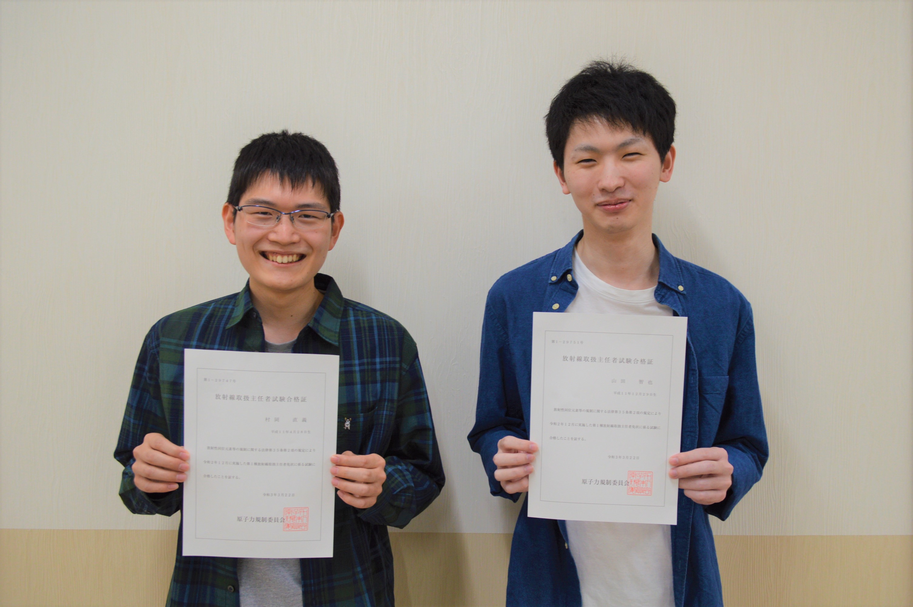本学学生の村岡直義さん(診療放射線学科/4年)と山田智也さん(同)が、第1種放射線取扱主任者に合格しました。