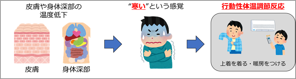 寒冷環境に暴露されることで皮膚や身体深部の温度が低下すると、私たちヒトは寒さを感じます。この寒いという感覚は、「上着を着る」や「暖房をつける」といった行動性体温調節反応を引き起こします。