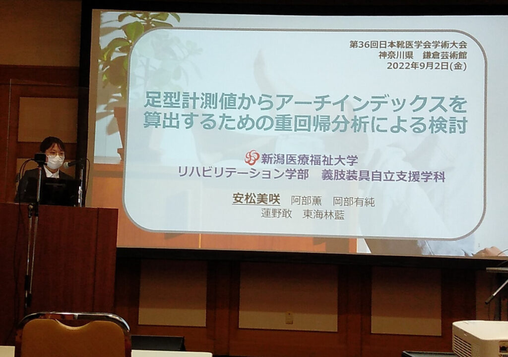9月2~3日、神奈川県鎌倉市・鎌倉芸術館で行われた第36回日本靴医学会学術集会において、義肢装具自立支援学科の阿部薫教授が指導する、学部生3名、大学院生2名が学会発表を行いました。日本靴医学会は、整形外科医を中心とする医学会で大変権威のある学会です。なお発表者と演題は次の通りです。