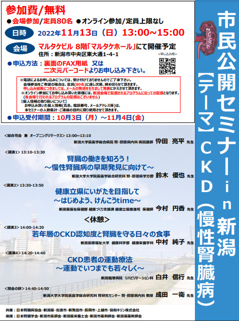11月13日(日)に、市民公開セミナーin新潟 【テーマ:CKD(慢性腎臓病)】がハイブリッド形式(対面参加orオンライン参加)にて開催予定です。対面会場は、県内5会場(新潟会場・新発田会場・佐渡会場・長岡会場・上越会場)を予定しています。