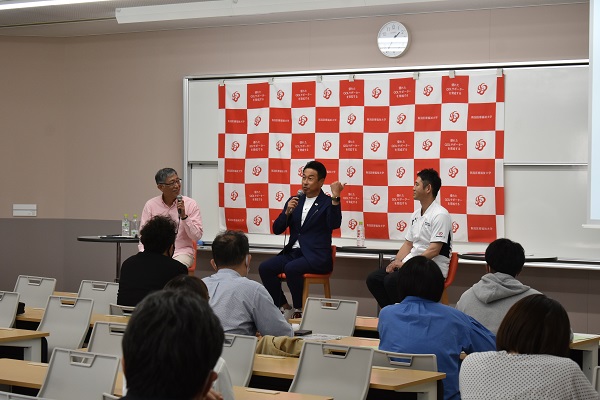 第1部ではゲストの元プロ野球選手 宮本和知さん、本学心理健康学科準備室長 山本裕二教授、鍼灸健康学科 木村啓作准教授 のトークセッションを行い、「心理」と「スポーツ」について、