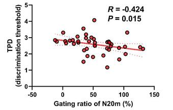 図2. 二連発正中神経刺激に伴うN20m成分の抑制と二点識別覚閾値との関連性。