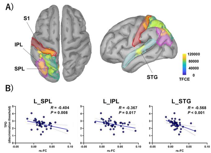 A) 全大脳におけるS1-seed betaネットワークと二点識別覚閾値との関連性(黄色の箇所は有意な関連性がある脳領域を示している)、B) 有意差を示した脳領域における二点識別覚閾値との関連性。略語:L_SPL, 左上頭頂小葉; L_IPL, 左下頭頂小葉; L_STG, 左上側頭回; TPD, two-point discrimination; rs-FC, resting-state functional connectivity。
