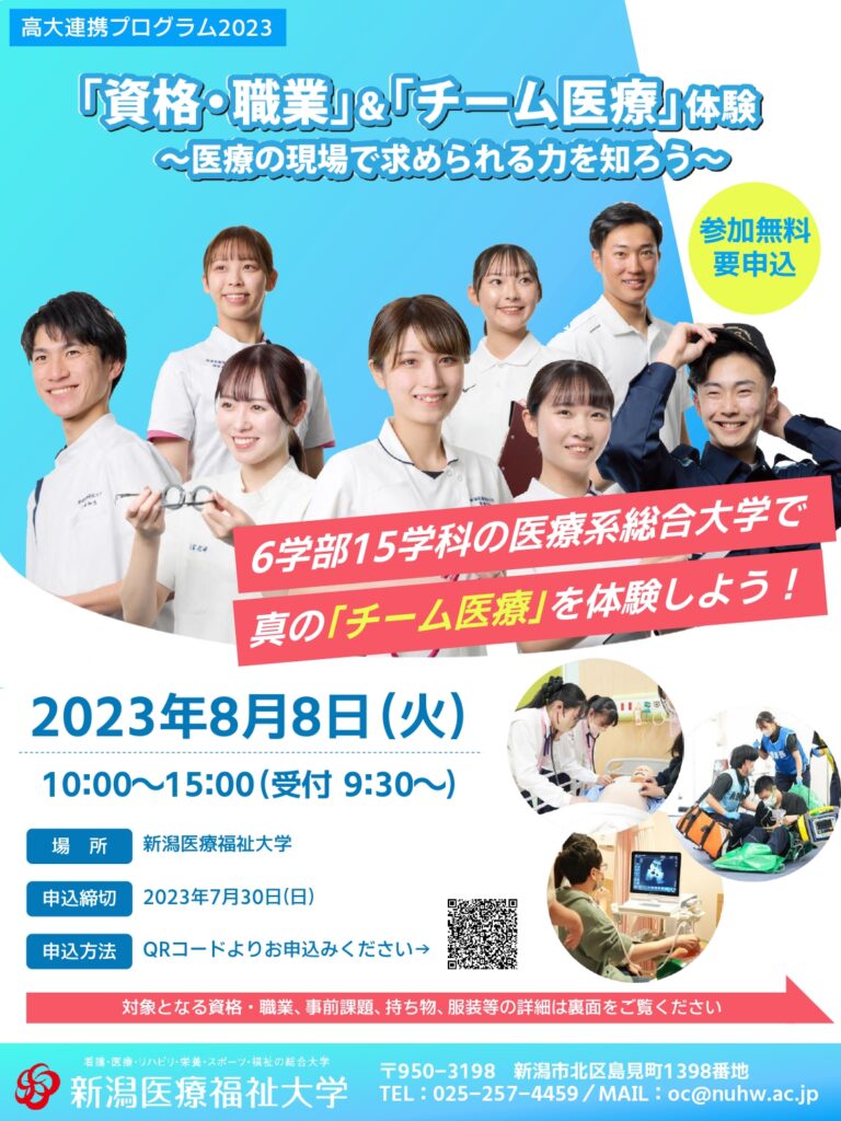 現在の医療現場では、多職種の医療専門職が連携しながら一人の患者さんの治療にあたる「チーム医療」が行われています。しかしながら、高校生のうちに、1つの専門職を理解する機会はあっても、他職種連携について理解する機会はほとんどありません。そこで、今回、「チーム医療体験会」を通じ、多職種連携の重要性について学んでいただくことを目的とします。
