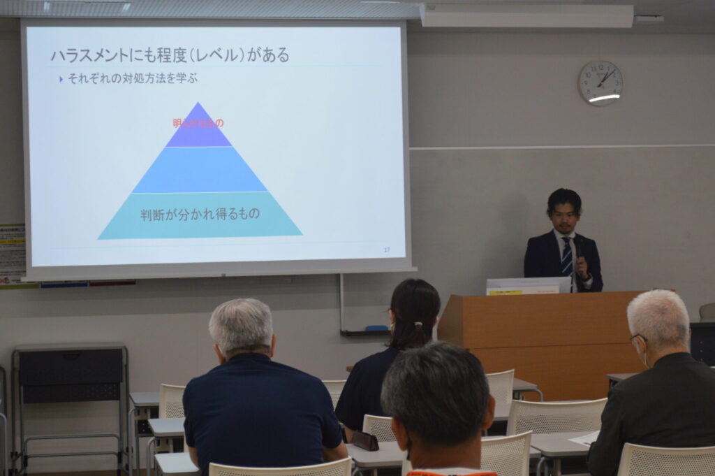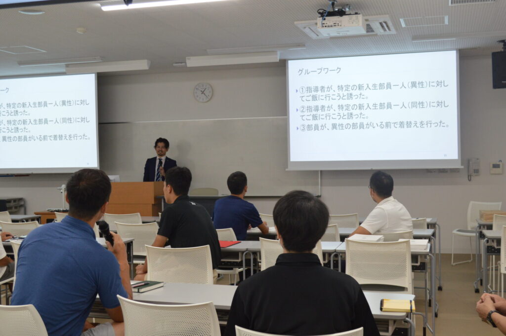 研修会では、パワーハラスメントやセクシャルハラスメントの概要と防止策について、大学運動部の特性や環境を踏まえた説明をしていただくとともに、不祥事対応の方法についてもお話しいただきました。会の途中には、事例をもとにハラスメントに該当するかどうかを考えるグループワークを行い、ハラスメントに該当しないようにするための留意点や必要な言動について確認をしました。