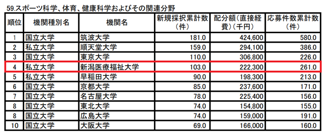 2023年8月、令和5年度(2023年度)科学研究費の配分について文部科学省から公表されました。その中で、新潟医療福祉大学(新潟県新潟市、学長:西澤 正豊)は、「スポーツ科学、体育、健康科学、およびその関連分野」において、2023年度は、新規採択累計数が103件となり、全国第4位(私立大学2位)となりました。トップ10に入った大学は全て首都圏大学もしくは国立大学で、創立100年以上の歴史を持つ中、地方の本学が上位にランクインすることができました。