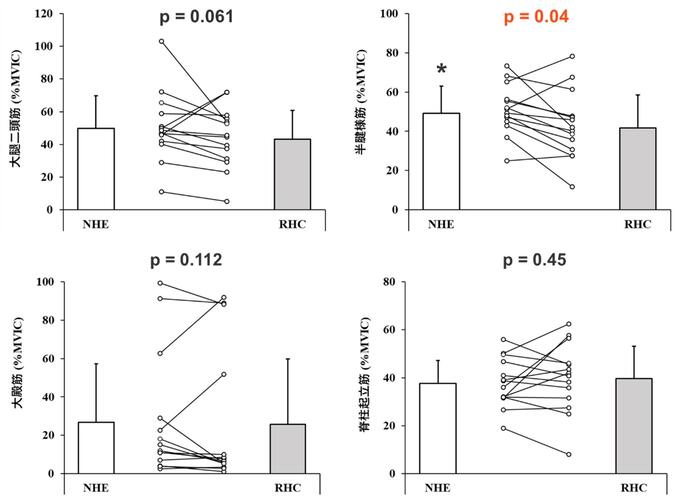 2. 半腱様筋の筋活動はNHEがRHCと比較して有意に高値を示しました.