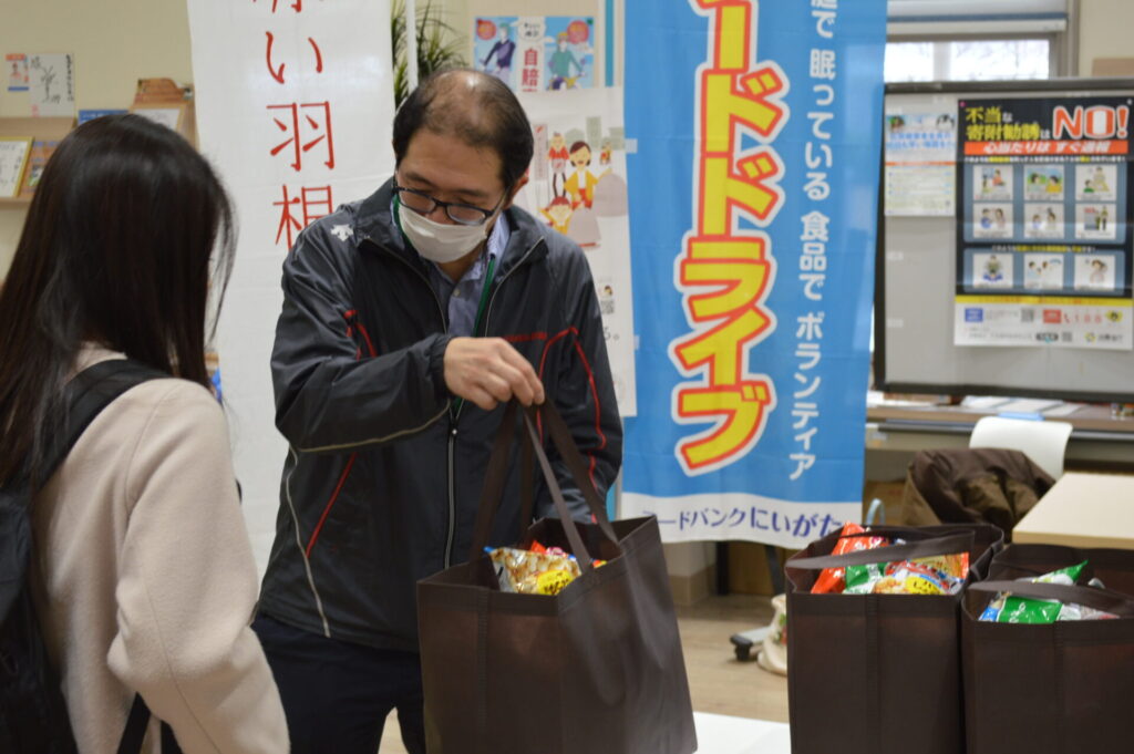 新潟市北区社会福祉協議会は、資源価格の上昇や円安の進行を背景とする物価高騰により経済的な影響を受けている学生が安心して学生生活を送ることができるよう、定期的に本学学生に対する支援を行っています。今回は、赤い羽根共同募金歳末事業助成金を財源に、フードバンクにいがた提供の食料品や新潟市北区内で販売されている食料品・日用品が袋詰めされた「食料品等応援パック」を本学学生に配布していただきました。