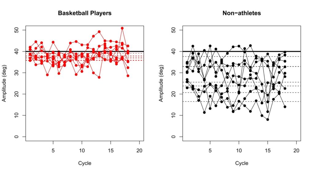 視線解析技術を応用した測定機器を使用し、新潟アルビレックスBBラビッツに所属する女子プロバスケットボール選手の眼球運動を測定しました。その結果、極めて速い速度 (100 deg/s) で往復移動する視標に対して、非選手は追視が間に合わないことが多いその一方で、バスケットボール選手は視標に近い位置に視線移動出来ていることが明らかとなりました。またバスケットボール選手はsaccadeという速い眼球運動の発生が、特定のタイミングに集中していました。これらのことからバスケットボール選手は非選手よりもsaccadeを規則的に行うことが可能で、その結果、高速に移動する視標に対する視線移動が正確である可能性が示唆されました。