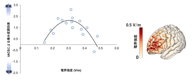近年、痛みへの治療法としてtACSが注目されていますが、知見が不足しております。本研究により、背外側前頭前野のtheta帯域活動やbeta帯域活動を増大させることで、鎮痛効果が得られる可能性が示されました。さらに、tACSによる効果には脳内に生じる電界と逆U字型の相関関係があることが示されました。研究の結果は、痛みに対する治療法としてのtACSの発展に繋がるのではないかと考えております。