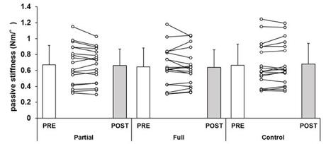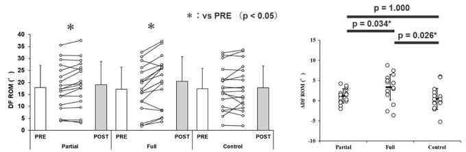 1. 広い範囲でのレジスタンストレーニング(Full)は狭い範囲でのレジスタンストレーニング(Partial)と比べて大きいROM増加効果が認められました.