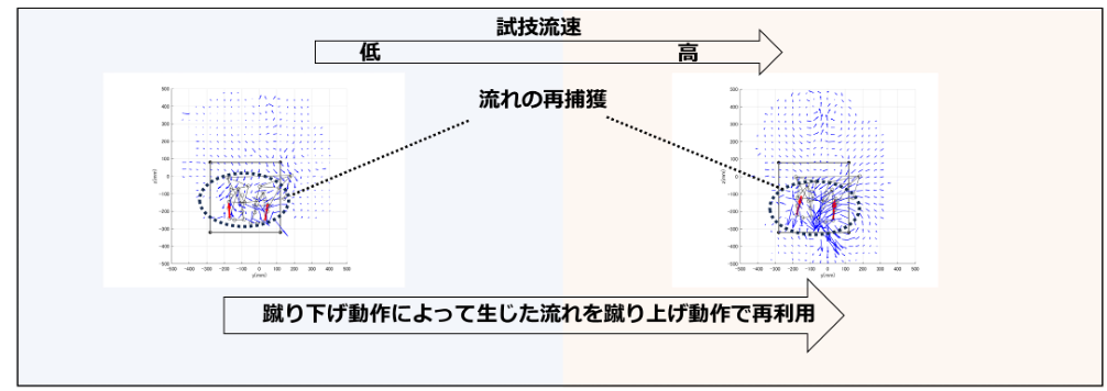 その結果、泳ぐスピードを上げると、脚を動かす速さが上昇したことに加えて、両足の動きが、蹴り下げ動作では互いに離れる方向に、蹴り上げ動作では互いに近づく方向に変化しました(図1)。このような動作の変化によって、キック中により強い渦が生成され、推進力が増加する要因となっている可能性が示されました。また、脚を蹴り下ろす動作から蹴り上げる動作に移行する局面で、蹴り下ろし動作の際にできた水の流れを再利用する現象が観察され(流れの再捕獲)、この現象は泳ぐスピードが上がるにつれて顕著になりました(図2)。流れの再捕獲は昆虫の飛翔や魚類の泳ぎでも観察されており、エネルギーを効率よく使い、推進力を増加させる働きがあると考えられています。