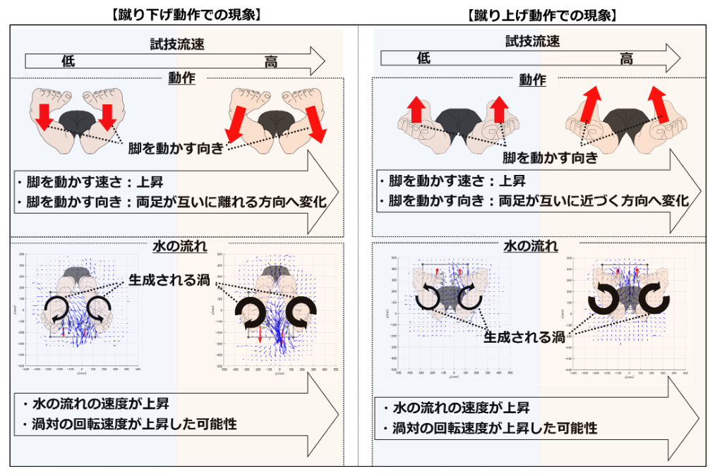 その結果、水中ドルフィンキックの下肢動作において、泳ぐスピードが上がるにつれて水の流れの速度が増大し、キック中により強い渦が生成され、推進力が増加する要因となっている可能性が示されました。また、蹴り下ろし動作から蹴り上げ動作に移行する局面で、蹴り下ろしで生成された流れを再利用する現象が観察され、この現象は泳ぐスピードが上がるにつれて顕著になりました。本研究は、キック泳中の泳ぐスピードを変化させた際の水の流れの変化を観察した初めての研究です。