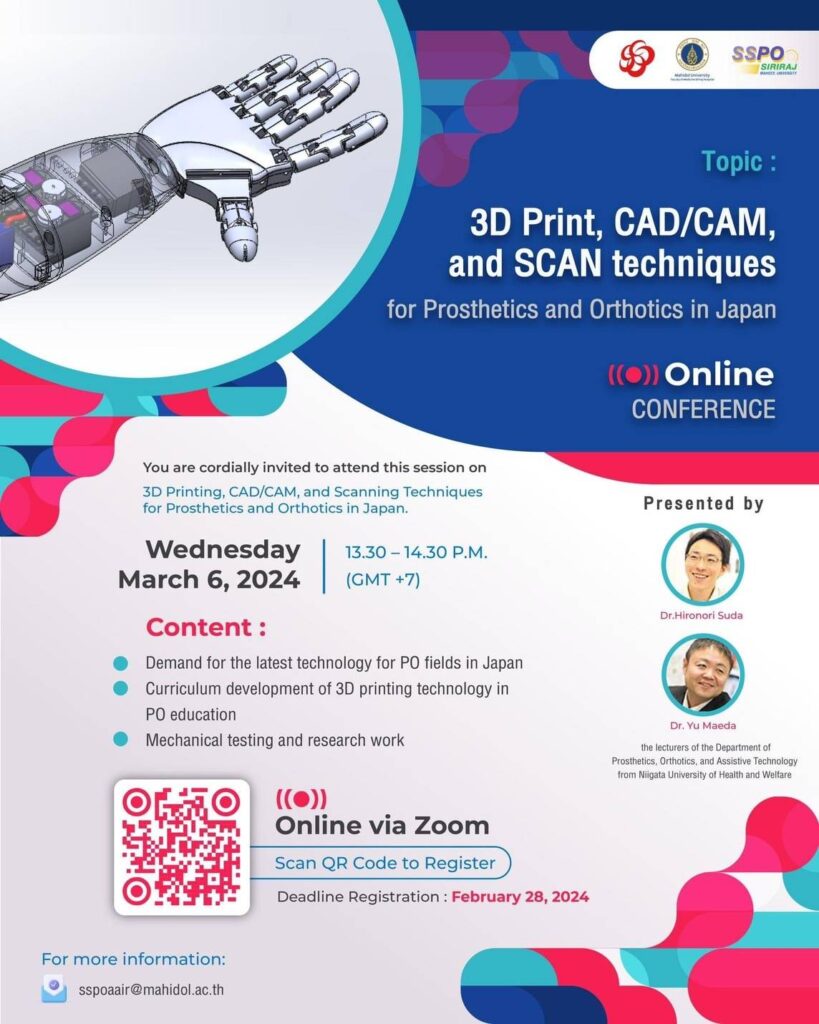 その中で、3/6(水)13:30~14:30にタイ王国のSirindhorn School of Prosthetics and Orthotics (SSPO)にて本学義肢装具自立支援学科の須田先生、前田先生が現地の学生・企業約140名に「3D Print,CAD/CAM and SCAN techniques for Prosthetics and Orthotics in Japan」という題名で日本の3Dスキャン・プリンタに関する最先端技術と教育のセミナーを実施しました。神田先生と本学卒業生1名が司会者を務めました.