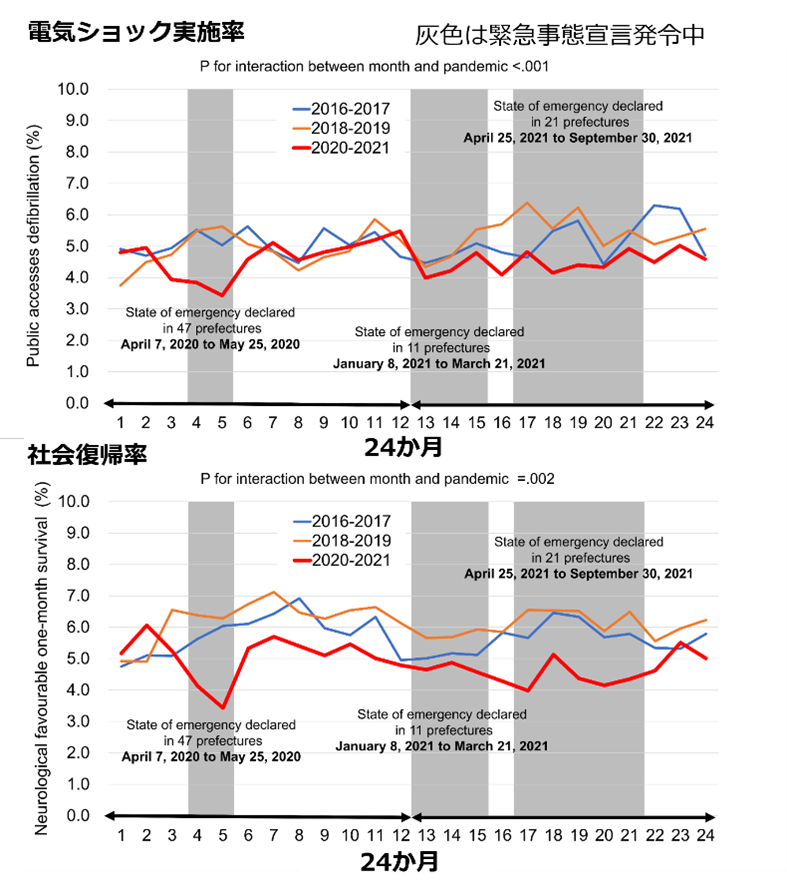 2020年からの新型コロナウイルス感染症のパンデミックでは、救急医療体制も大きな影響を受けました。今回、緊急事態宣言等の行動制限が心停止の現場に居合わせた市民による心肺蘇生やAED(自動体外式除細動器)の使用にどのような影響を与えたのかを評価しました。
