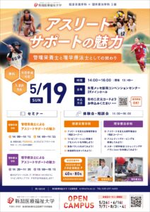 5月19日(日)に、朱鷺メッセにて、「アスリートサポートの魅力~管理栄養士と理学療法士としての関わり~」を紹介するセミナーと体験会・相談会を開催します!