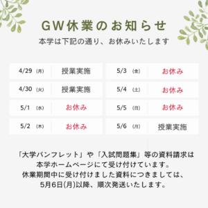 本学は、5月1日(水)~5月5日(日)までの間、ゴールデンウィーク休業期間となりますのでお知らせいたします。