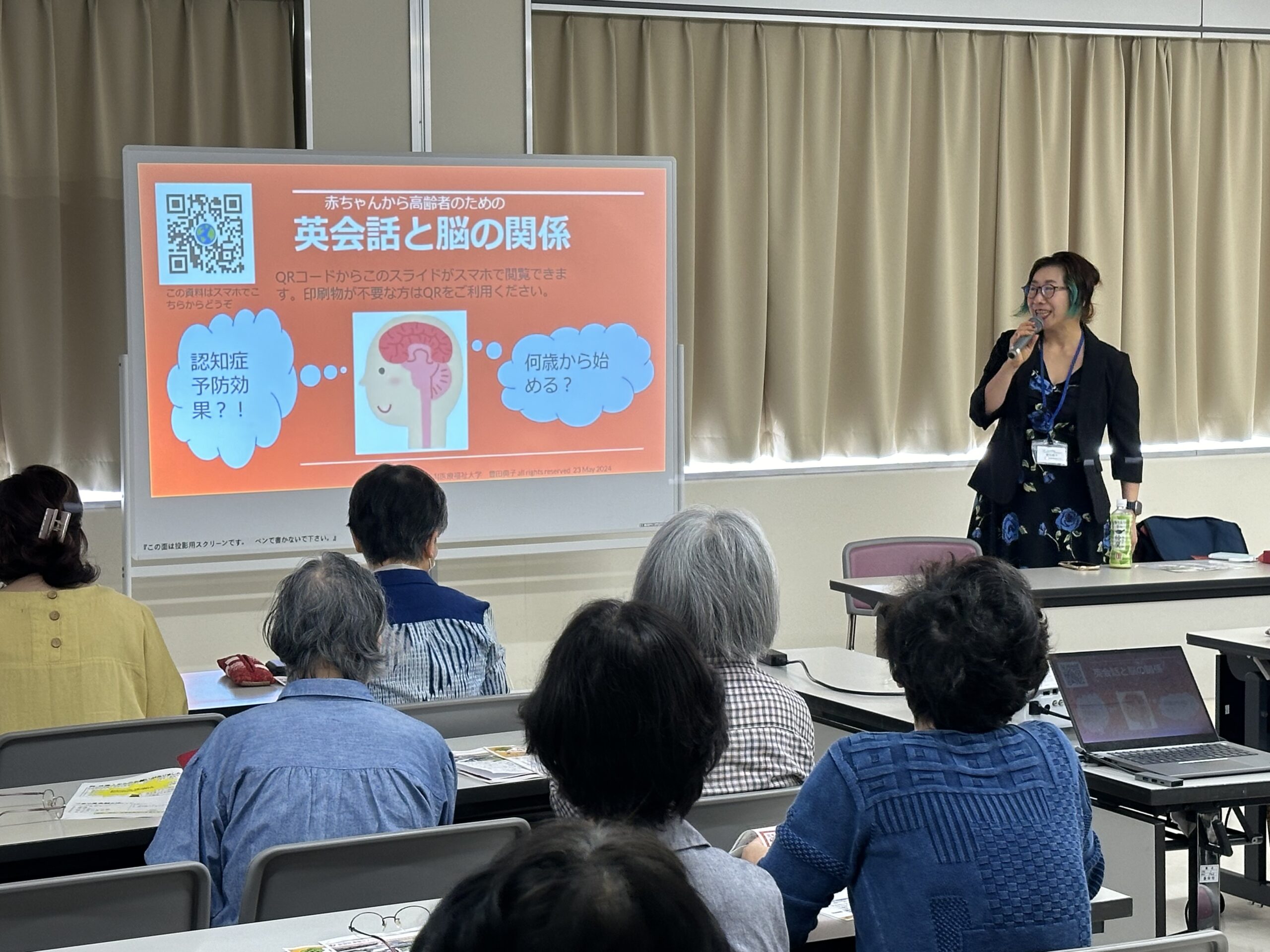 講演では、バイリンガル、第二言語習得が認知症予防に効果があると示唆する研究についての説明と、スコットランドと新潟の高齢者施設での実例を紹介しました。また、英会話の実演と練習や英語学習法の相談コーナーを行いました。