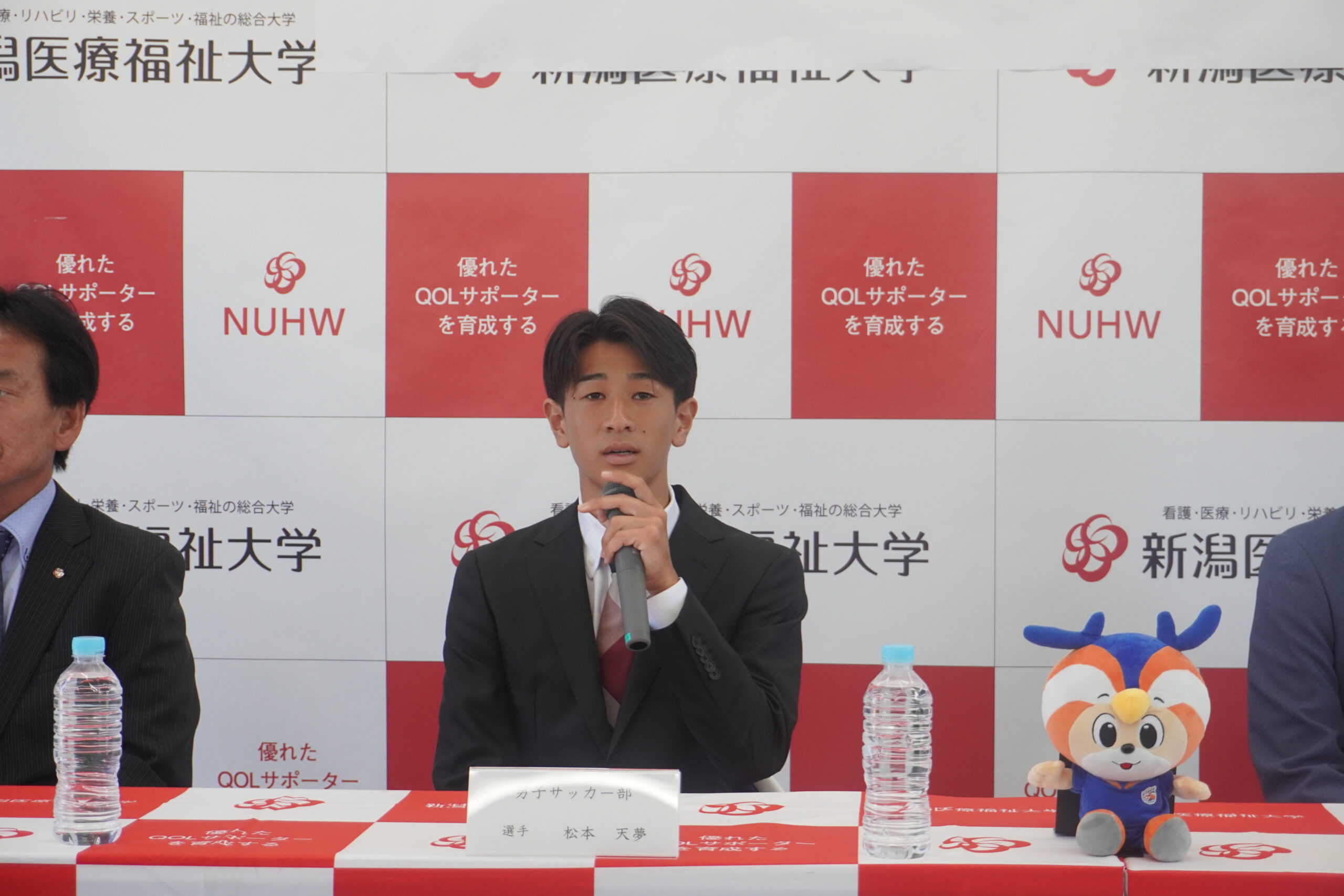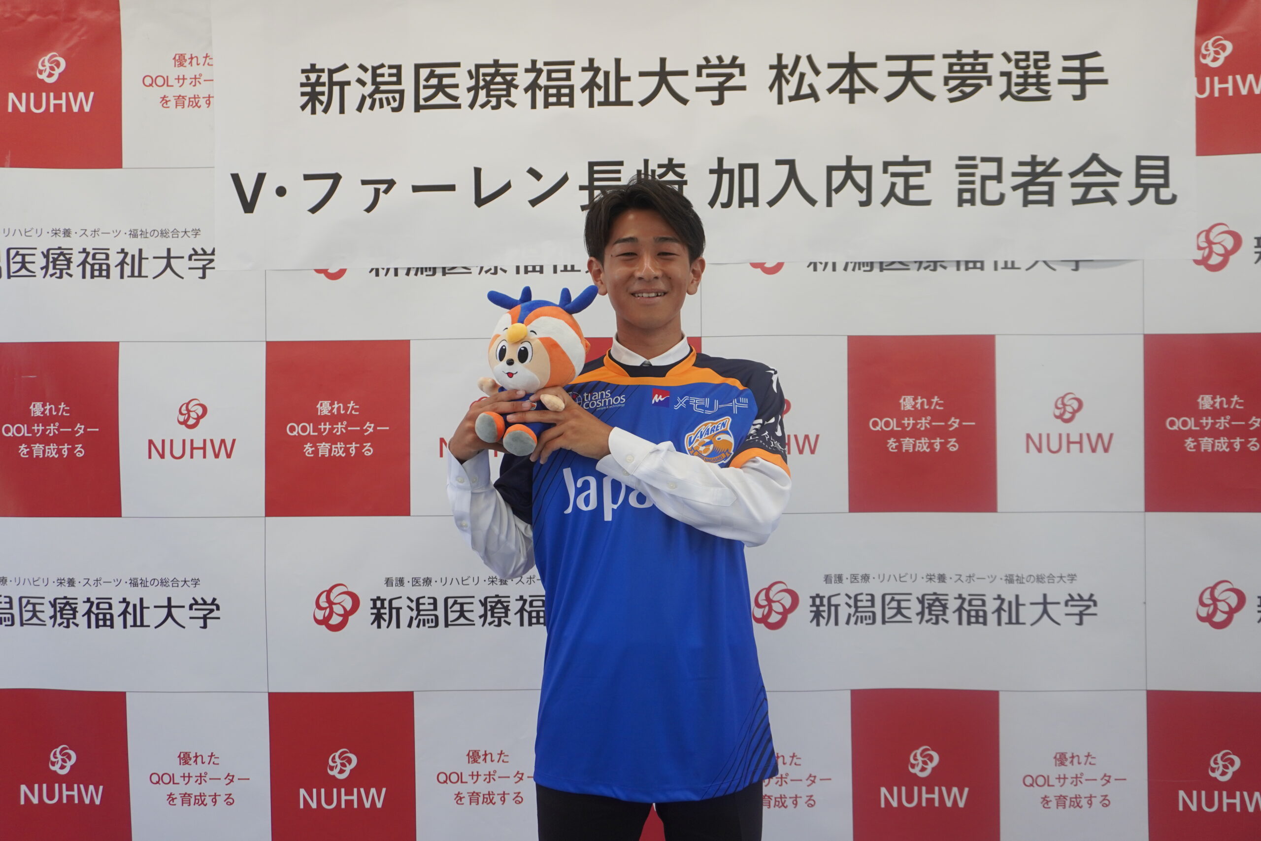 松本選手は実際に長崎のユニフォームに袖を通し、今後の意気込みを語りました。 「小さいころからの夢であったサッカー選手になれることをうれしく思います。少しでも早く、結果を残せるようにがんばりたいです。自分の特徴としてドリブルがあるので、プロでどれぐらい通用するか試したいです。」