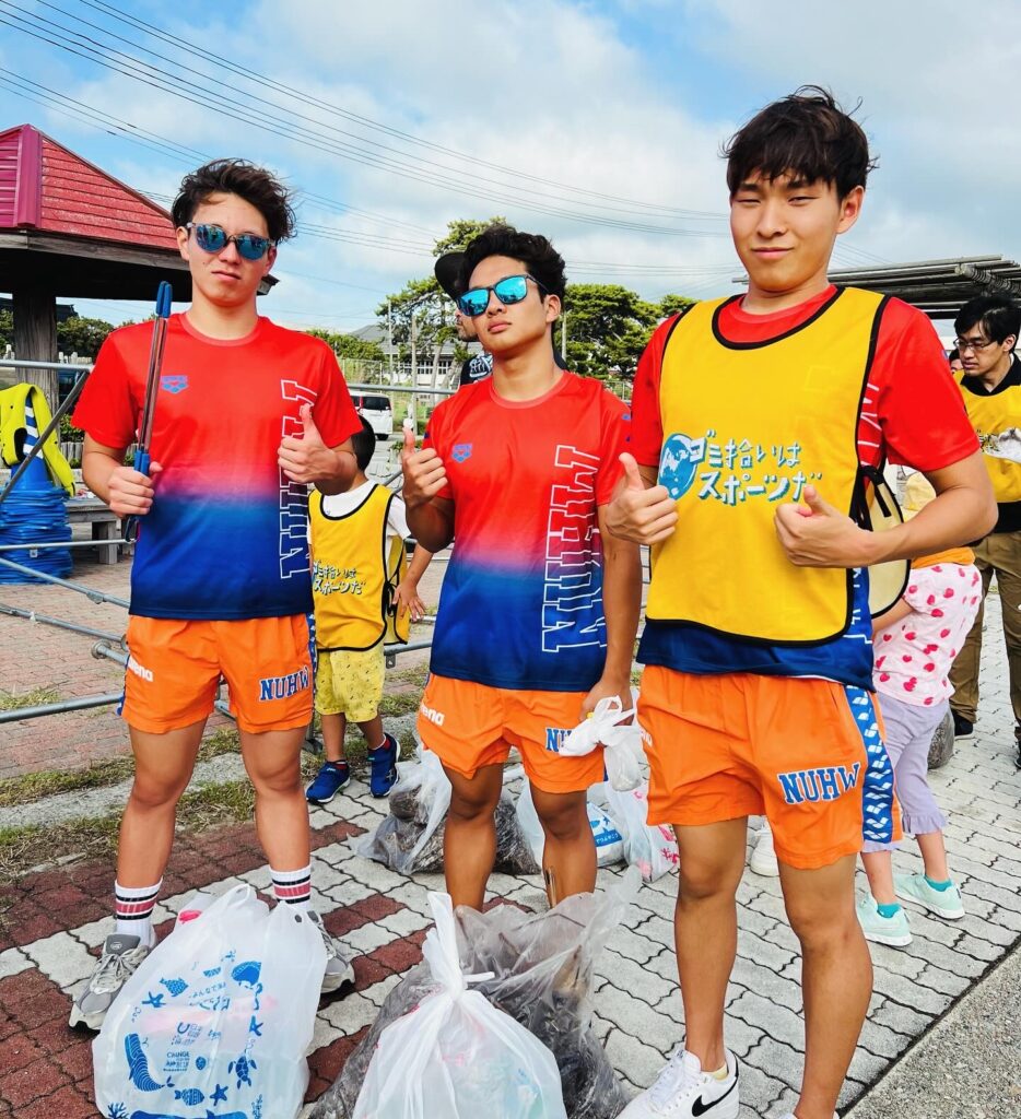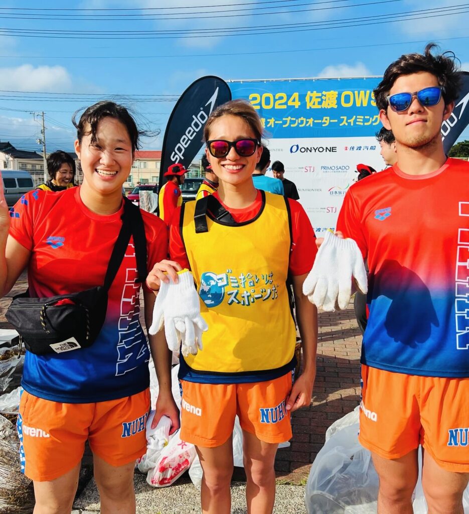今回佐渡オープンウォータースイミングと同時に開催されたスポGOMI に参加しました。初めてスポGOMIに参加して、自分たち1年生チームは、かなりのゴミを拾うことかできたと思っていましたが、他のチームは何倍もの量のゴミを抱えて集合場所に帰ってきたので驚きました。今回のスポGOMIという取り組みを通して、海に落ちているゴミだけではなく町中に落ちているゴミにも気がつくようになりました。ゴミが落ちていることは誰もが少しは不快な気持ちになるはずです。このような活動を通して、少しだけでも佐渡の街だけではなく、地球上のゴミが少なくなっていってほしいと思いました。
