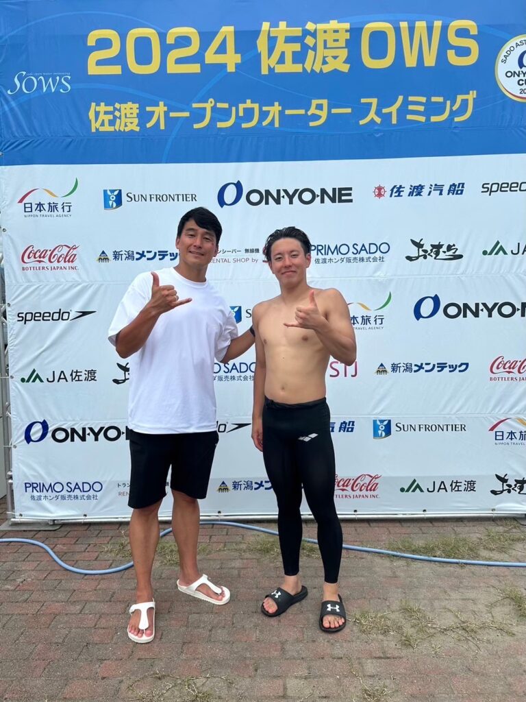 (オープンウォータースイミングの)大会後は、スポGOMIアンバサダーの松田丈志さんと記念撮影(下写真)。