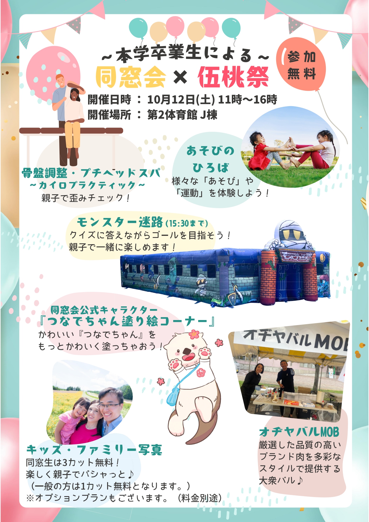 様々なプログラムが用意されています! 〇骨盤矯正・プチヘッドスパ~カイロプラクティック~ 〇あそびのひろば 〇モンスター迷路(午後3時30分まで) 〇同窓会公式キャラクター『つなでちゃん塗り絵コーナー』 〇キッズ・ファミリー写真 〇オヂヤバルMOB