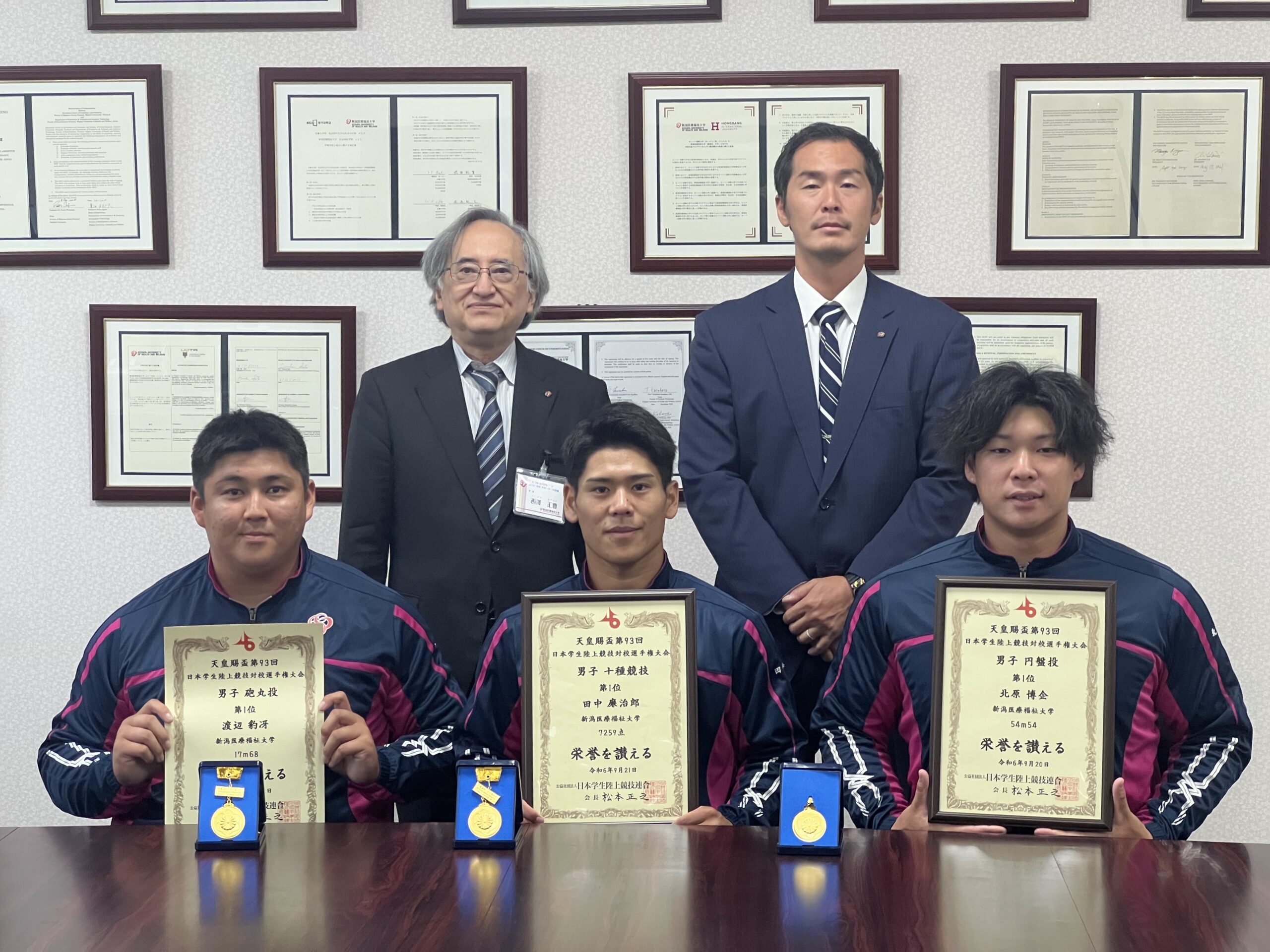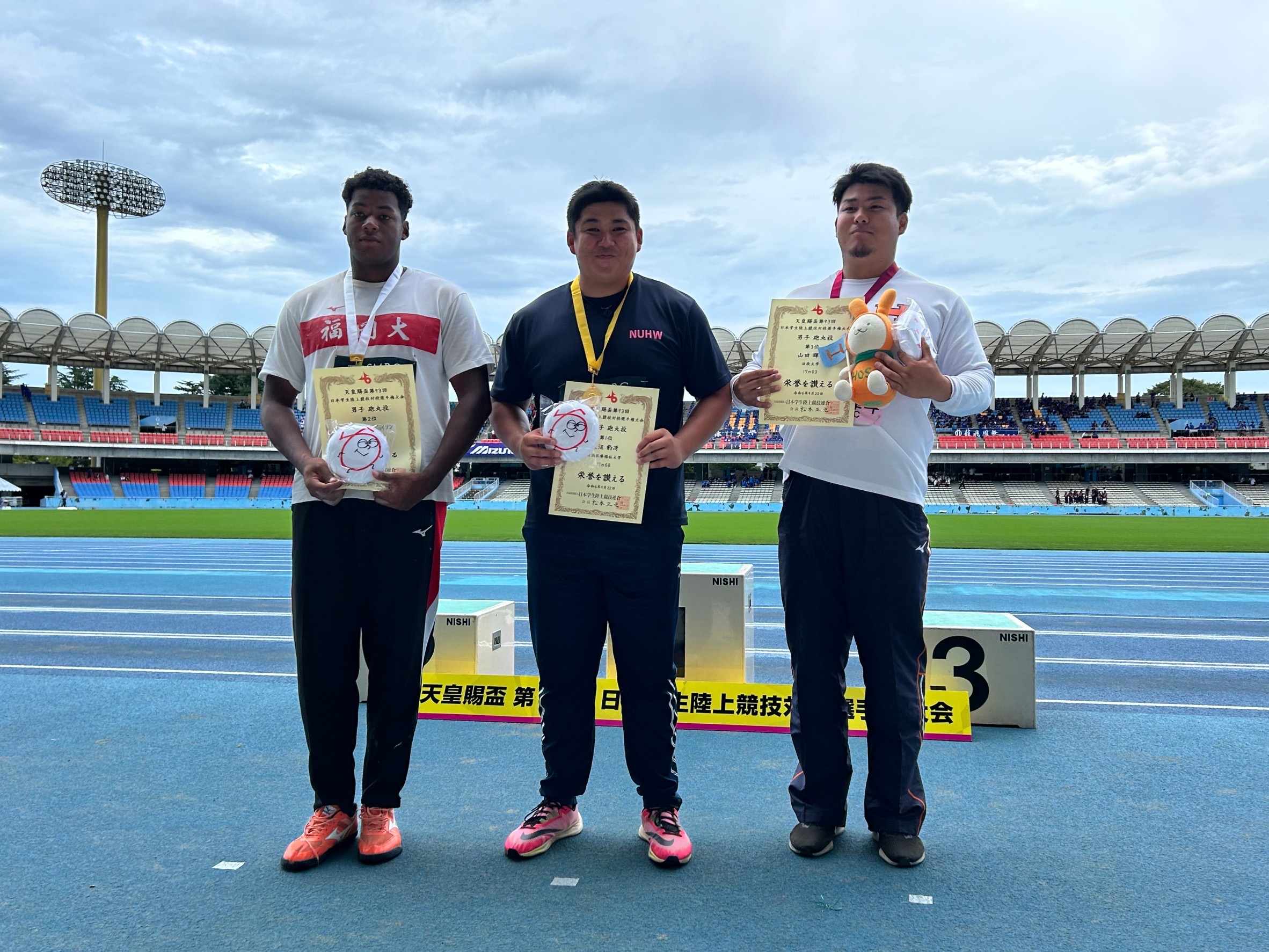新潟医療福祉大学陸上競技部は9月19日~22日に行われた「第93回日本学生陸上競技対校選手権大会」に出場しました。そのなかで北原博企さん(健康スポーツ学科4年)が男子円盤投、渡辺豹冴さん(健康スポーツ学科2年)が男子砲丸投、田中廉治郎さん(大学院1年)が男子十種競技でそれぞれ優勝を果たしました。