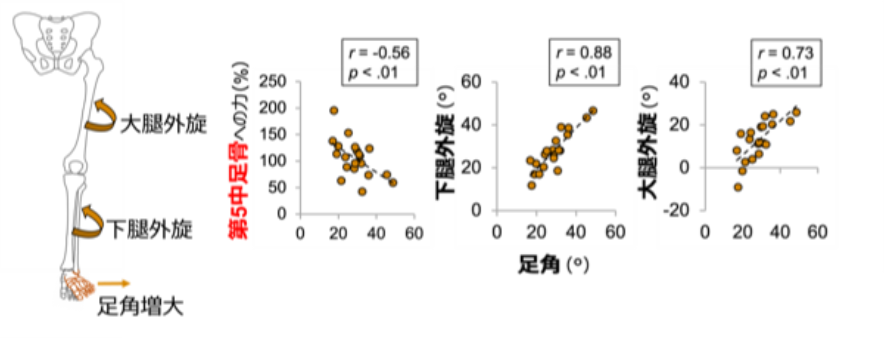 足部接地時の足角(足の向き)が大きいほど、動作時の下腿および大腿の外旋が大きく、第5中足骨への力学的負荷が小さくなった点。