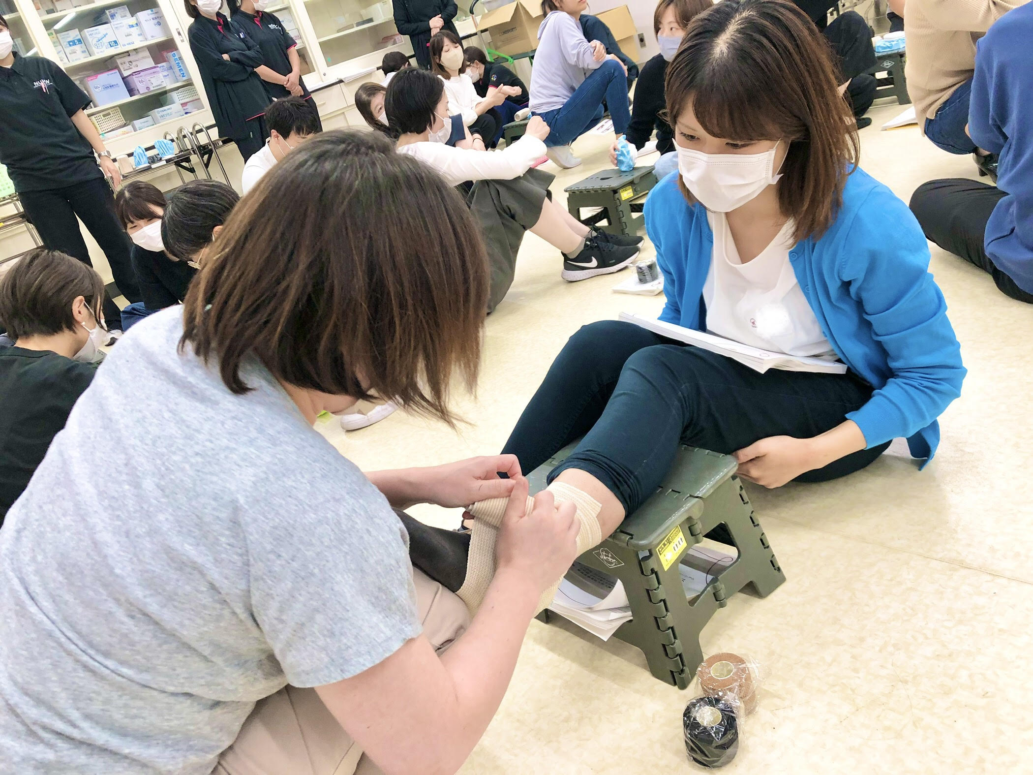 ■スポーツ外傷直後の応急処置やテーピングの巻き方について学んでいる様子
