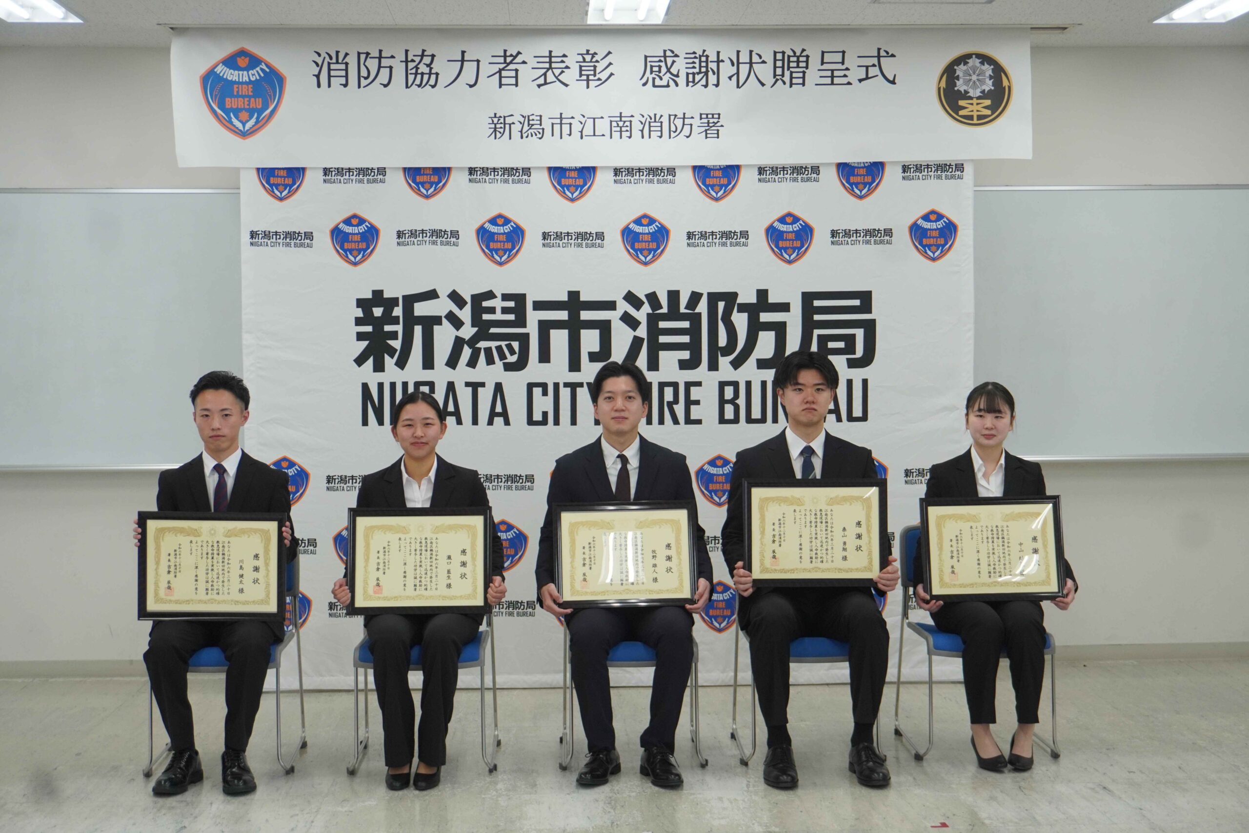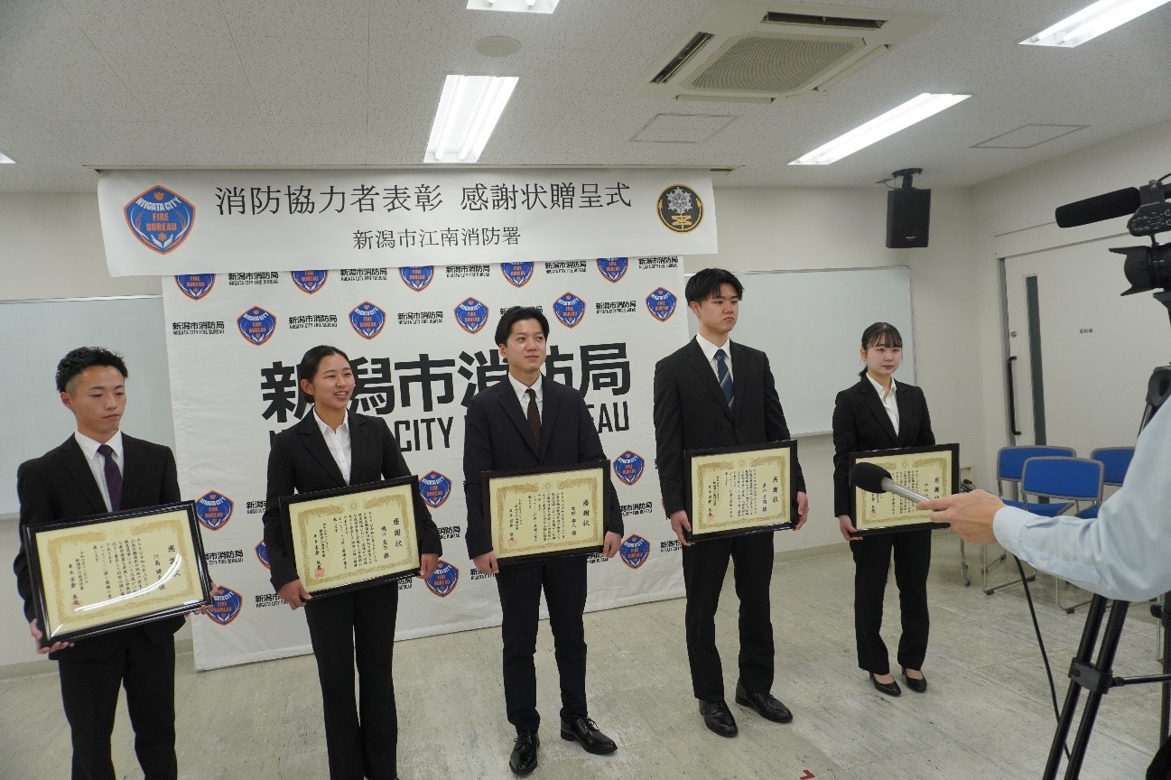 新潟市江南消防署の感謝状贈呈式に出席した学生5名。