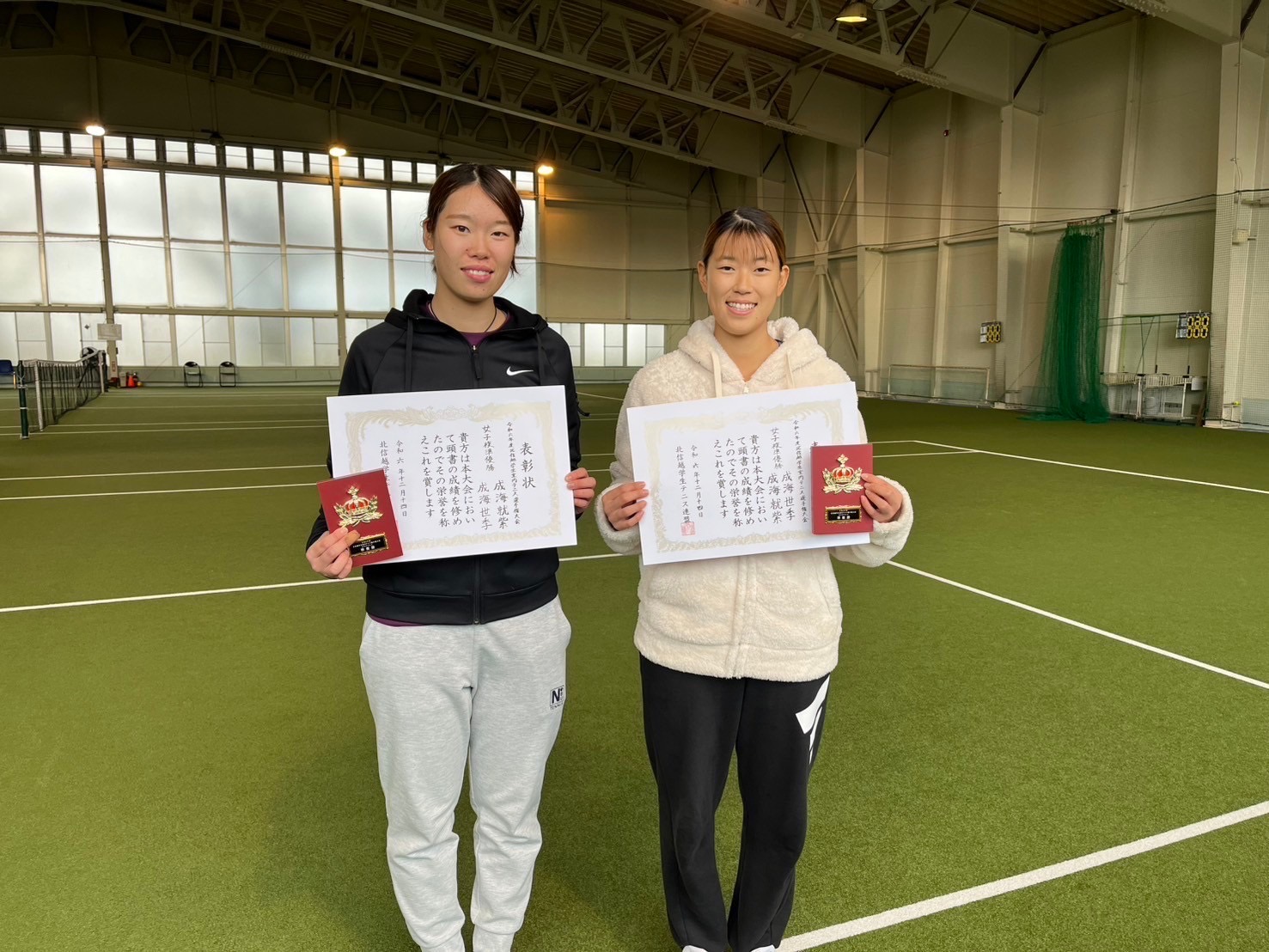 これまで練習してきたことを存分に発揮し、楽しむ気持ちでプレーできました。準決勝では姉(成海就紫)と対戦する特別な経験をしましたが、勝利を収めることができました。そして、監督や部員を始め、心理健康学科の先生・友達、家族の支えがあり、一戦一戦を全力で戦い抜くことができました。今大会の経験を生かし、来年の春大会に向けて、更にレベルアップできるよう練習に取り組んでいきます。