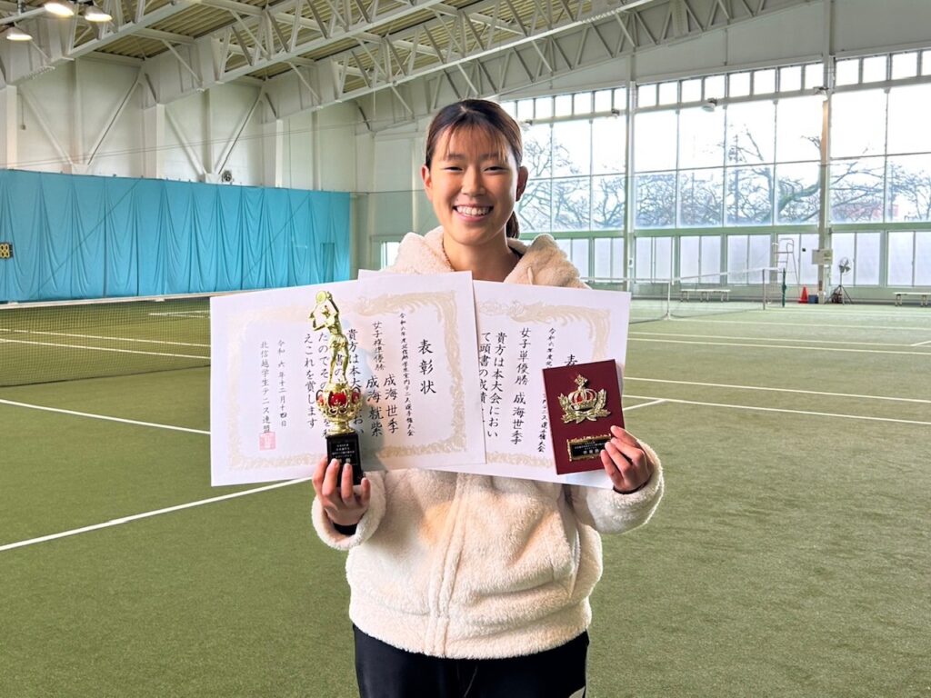 新潟医療福祉大学テニス部は、12月13日~15日にシバタロイヤルテニスクラブ(新潟県新発田市)で行われた「北信越学生室内テニス選手権大会」に出場しました。女子シングルスにおいて、本学の成海世季(心理健康学科1年)が女子シングルスで初の優勝を飾りました。1回戦で第1シードを破り、準決勝では本学の成海就紫(健康スポーツ学科4年)との姉妹対決を制しました。決勝戦では本学の中村由良(救急救命学科1年)を下し、優勝を果たしました。