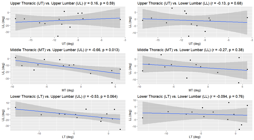 アラベスクはダンサーの腰痛の原因であることが示唆されており、下部腰椎の過伸展は腰部に過剰な負担がかかると推察されています。脊柱の動きは分節によって異なり、分けて評価する必要がありますが、アラベスクにおける胸椎角度と腰椎角度の関連性は明らかになっていませんでした。本研究はダンサーの腰痛を予防するための知見になると考えております。