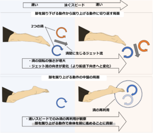 その結果、泳ぐスピードを上げると、足の周りに生成される渦の回転の強さが大きくなることが分かりました。また、脚を蹴り下ろす動作から蹴り上げる動作に移行する局面で観察された渦の構造に変化が見られ、泳ぐスピードの増大に伴って、足の周りに生成される2つの渦の間に生じるジェット流注1)の向きがより鉛直下向きへと変化しました。さらに、スピードを上げると、脚を蹴り上げる中盤の局面で、脚の周りに生成された渦を再利用することにより生成する、身体を前に進める方向への水の流れが観察されました。渦やジェット流は水の運動量の変化を反映しており、身体が水からどのような力を受けたかを理解するヒントになります。本研究で観察された渦構造の変化は、蹴り上げ動作で身体を前に進めることに貢献している可能性が示されました(参考図)。