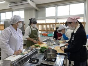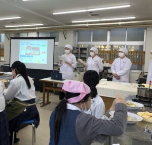 健康栄養学科鈴木ゼミでは、五泉市の高校生を対象に、将来の生活習慣病予防に役立てるための朝食講座を実施しています。今回は村松高校で、朝食をきちんと食べることの意義や、バランスのとれた食事についてのミニ講話を行い、高校生と一緒に調理実習も行いました。