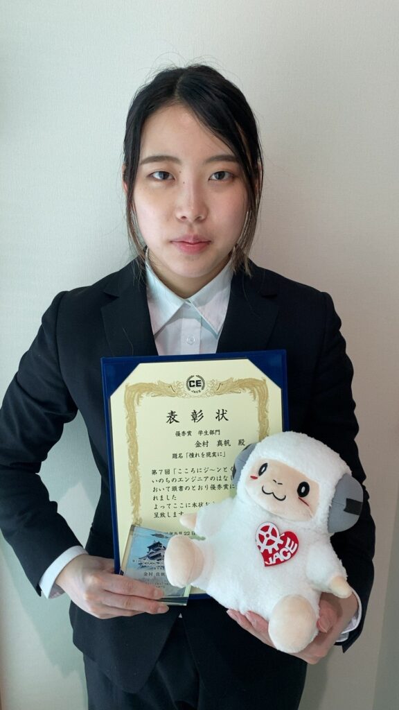 この度は優秀賞をいただくことができとても嬉しく思っています。今回、自分の気持ちを綴ることによって大学で学んだことや将来のことについて、改めて考える機会となりました。私は国家試験に合格すれば、1年後には臨床工学技士として社会に出ることになりますが、この気持ちを持ち続けていきたいと思います。今回、このような機会を与えてくださった関係者の皆様には深く感謝しております。