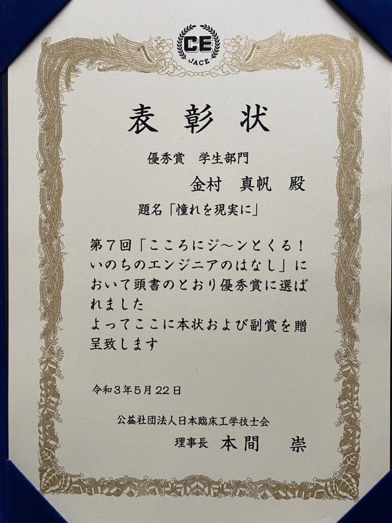 臨床技術学科4年生の金村真帆さんが、「第7回 こころにジーンとくる!いのちのエンジニアのはなし」に、臨床工学技士との出会いを綴ったエピソードを投稿し、今年5月の第31回公益社団法人日本臨床工学技士会にて、「優秀賞」を受賞いたしました。
