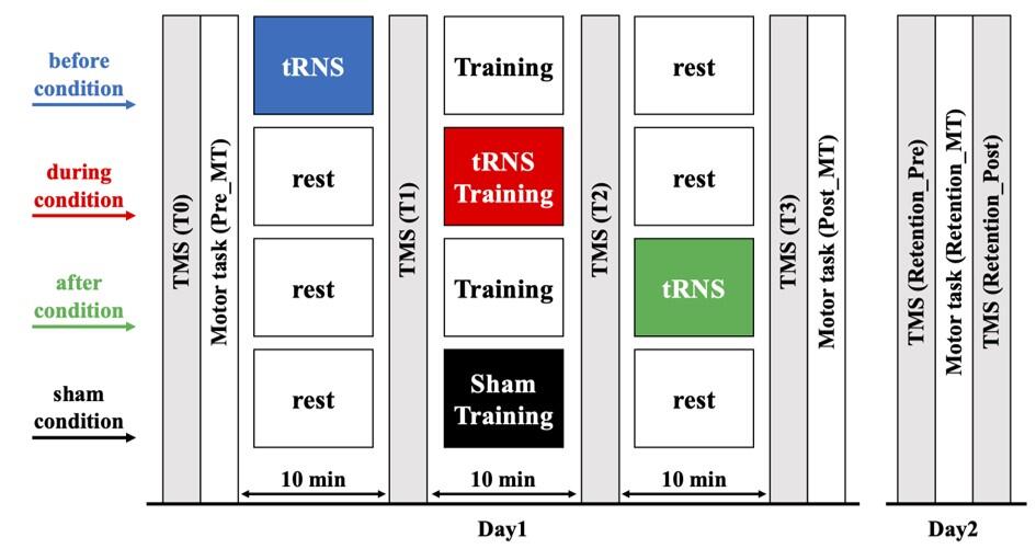 しかし、運動練習に対するtRNSの刺激タイミングが皮質脊髄路の興奮性と運動機能に及ぼす影響は明らかになっていません。そこで本研究では、運動練習に対して異なるタイミングでtRNSを実施し、tRNSの刺激タイミングの影響を調査しました。