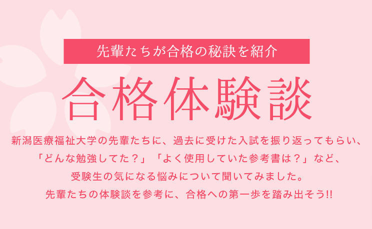 新潟医療福祉大学の先輩たちに、過去に受けた入試を振り返ってもらい、「どんな勉強してた?」「よく使用していた参考書は?」など、受験生の気になる悩みについて聞いてみました。