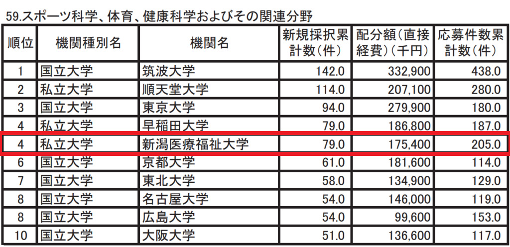 その中で、新潟医療福祉大学(新潟県新潟市、学長:西澤正豊)は、「スポーツ科学、体育、健康科学、およびその関連分野(リハビリテーション科学を含む)」において、採択件数(過去4年間の新規採択の累計数)が全国第4位となりました(私立大学では第2位)。