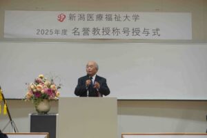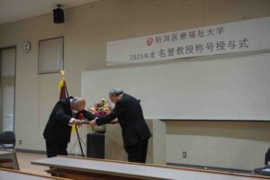 6月23日(月)、新潟医療福祉大学名誉教授称号授与式が開催されました。 今回は、計2名に、これまでの教育及び学術研究活動の顕著な功績を称え、名誉教授の称号が授与されました。 授与式と共に記念撮影も行われ、盛大な式となりました。新潟医療福祉大学は、今後も更なる教育及び学術研究活動に尽力して参ります。