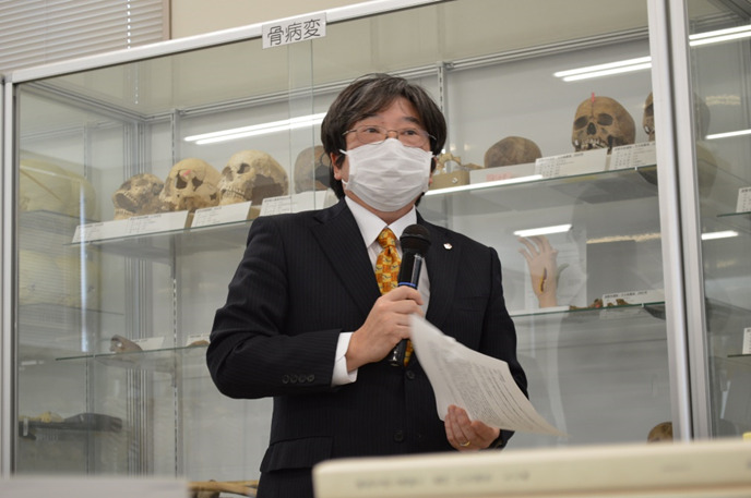 開所式には、教職員約40名と、新潟県内メディア5社が参加しました。開所式の後半では、2021年11月に阿賀野市土橋遺跡にて発見された4000年前の縄文時代の人骨や、長岡藩牧野家の藩主と正室の復顔模型を4個体(復元途中)など、本学内の展示資料を所長・奈良貴史教授より解説いただきました。