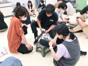 ■スポーツ外傷直後の応急処置やテーピングの巻き方について学んでいる様子