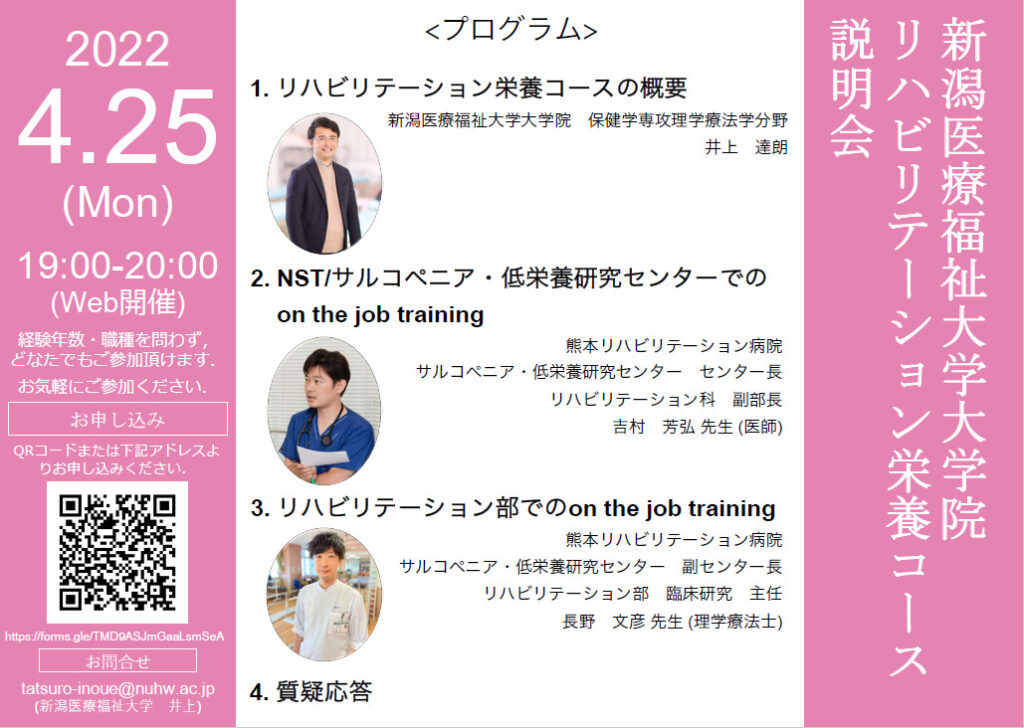 新潟医療福祉大学大学院保健学専攻理学療法学分野では、高度専門職業人育成コースとして、2023年度に「リハビリテーション栄養コース」を設置構想中です。