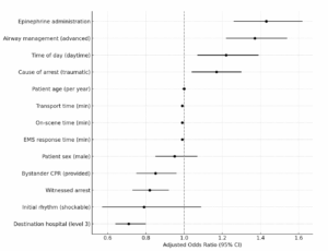 • 統計モデルにより、目撃された心停止や市民による心肺蘇生、救命救急センター等への搬送は、生存率の向上に有意に関連していました。